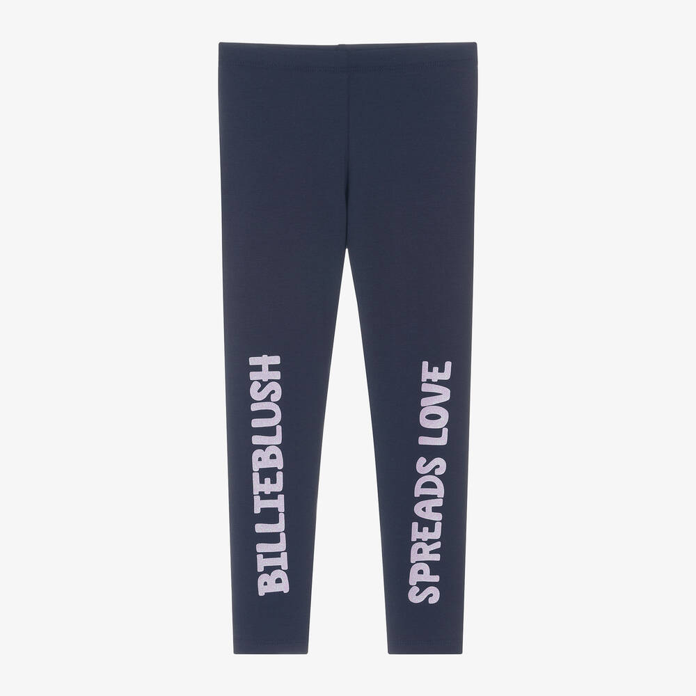 Navy blue leggings for girls by Billieblush, made in a comfortable cotton blend with plenty of stretch. Elasticated on the waist, these full-length leggings are detailed with glittery logo lettering in lilac purple. 'Billieblush Spreads Love' can be read across each leg.