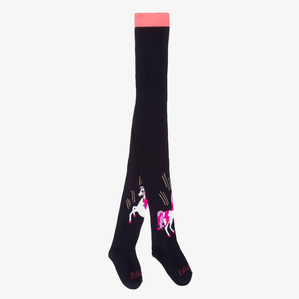 Fun navy blue tights for girls by Billieblush, knitted in a soft and stretchy cotton blend. Ideal for unicorn-obsessed little girls, they have a sparkly unicorn design in shimmery pink and purple and the brand's logo on the toes.