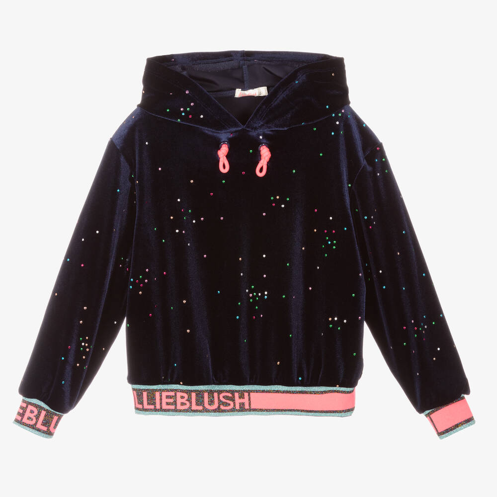 Navy blue hoodie for girls by Billieblush, made in soft and stretchy velour. It is trimmed with multicoloured metal studs and faux drawstrings on the hood. There's a glitter logo waistband and matching cuffs.