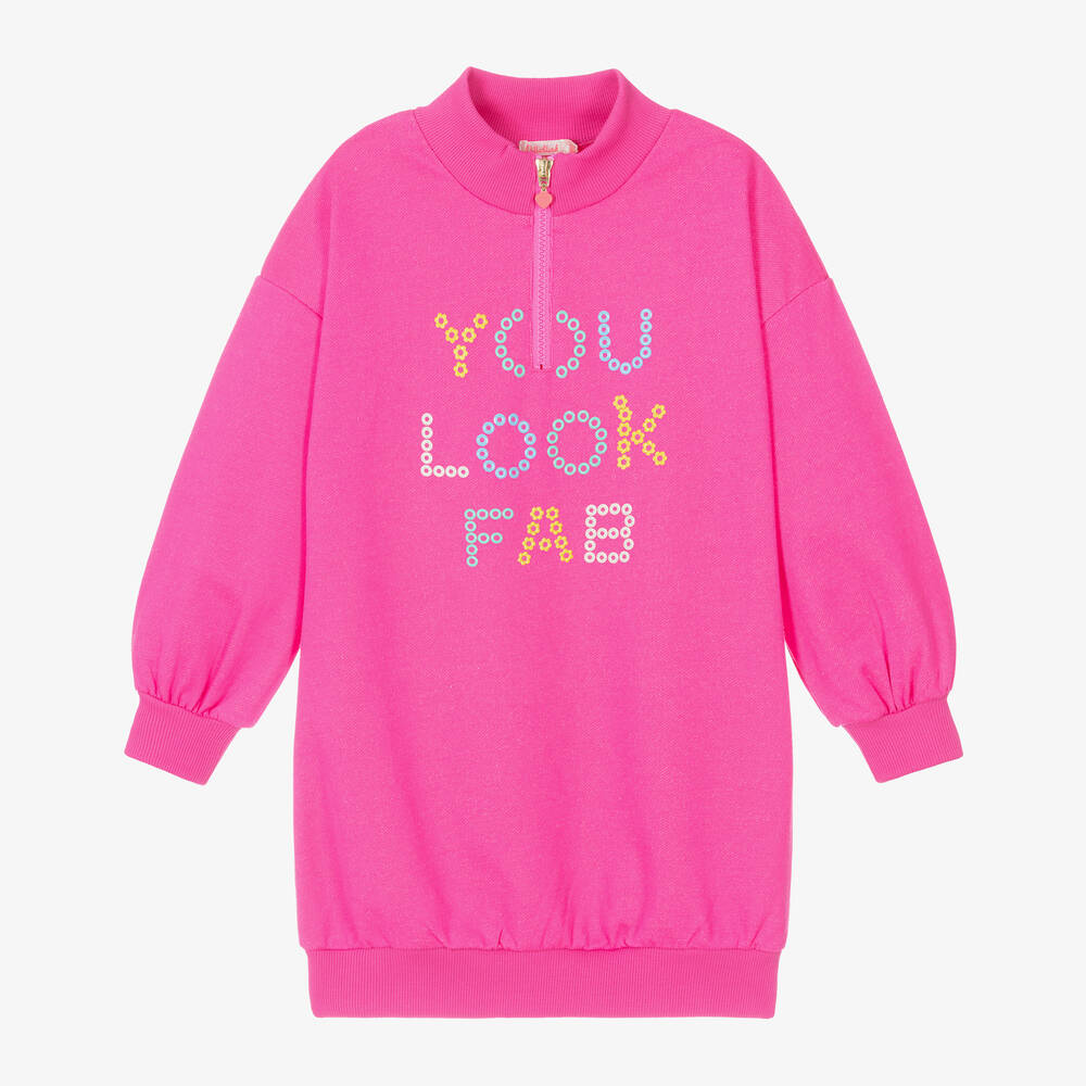 Bright neon pink sweatshirt dress for girls by Billieblush, with a 'You Look Fab' slogan in colourful round and flower-shaped eyelets on the front. Made in comfortable, cotton-blend jersey with ribbed trims, there is a half-zip fastening on the front.