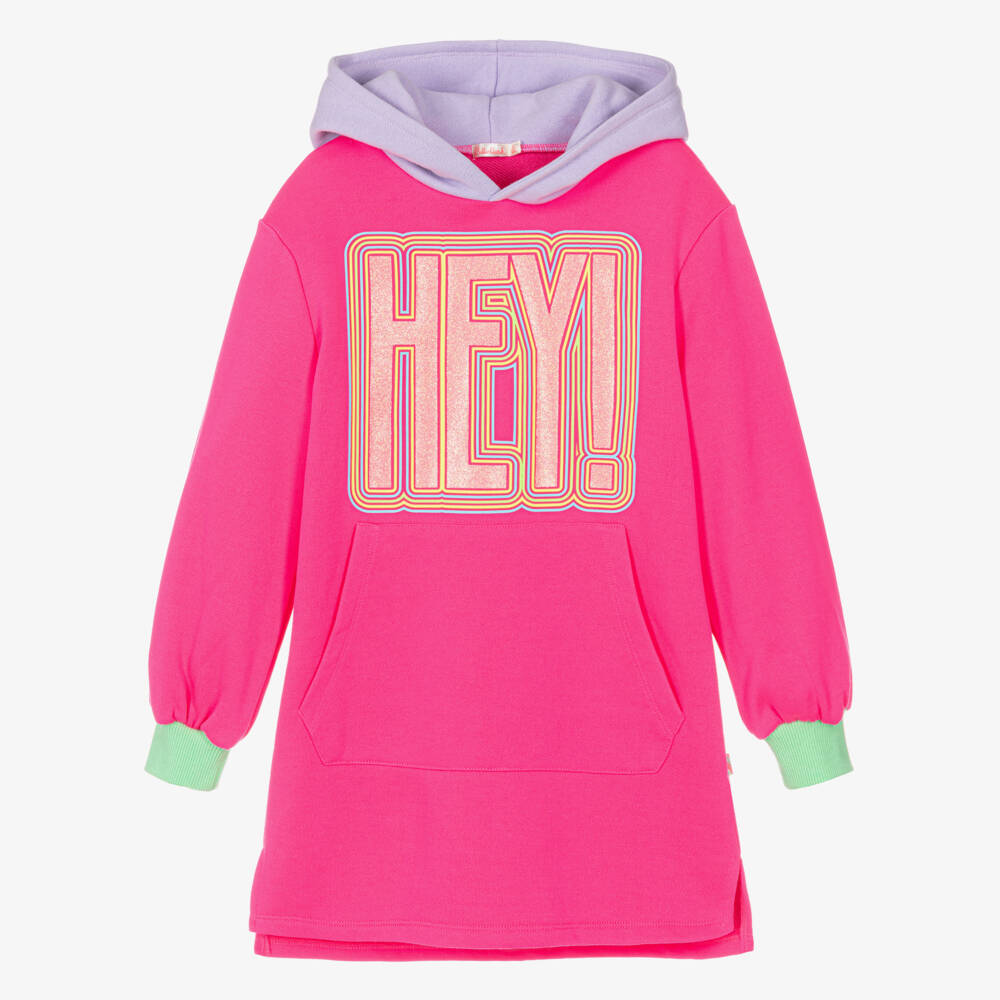 A super bright neon pink hooded sweatshirt for girls by Billieblush, made in a soft cotton jersey blend. Vibrant and playful, it has a sparkly statement 'hey!' slogan on the front, and cosy pastel green ribbed cuffs, a lilac hood and a useful pouch pocket on the front. It has the brand's logo tab on the side seam and it slips on easily over the head.