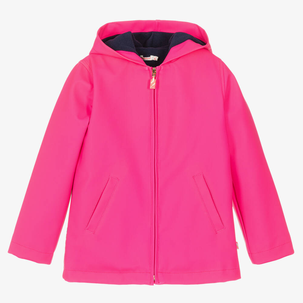 Neon pink hooded raincoat for girls by Billieblush. This cute water-resistant raincoat has an eye-catching, colourful dotted smiling face and logo print on the back. It is lined in breathable, navy blue microfibre fleece. It has a convenient zip fastening, with slanted pockets on the front, and the brand's signature logo tab on the side seam for a subtle designer touch.