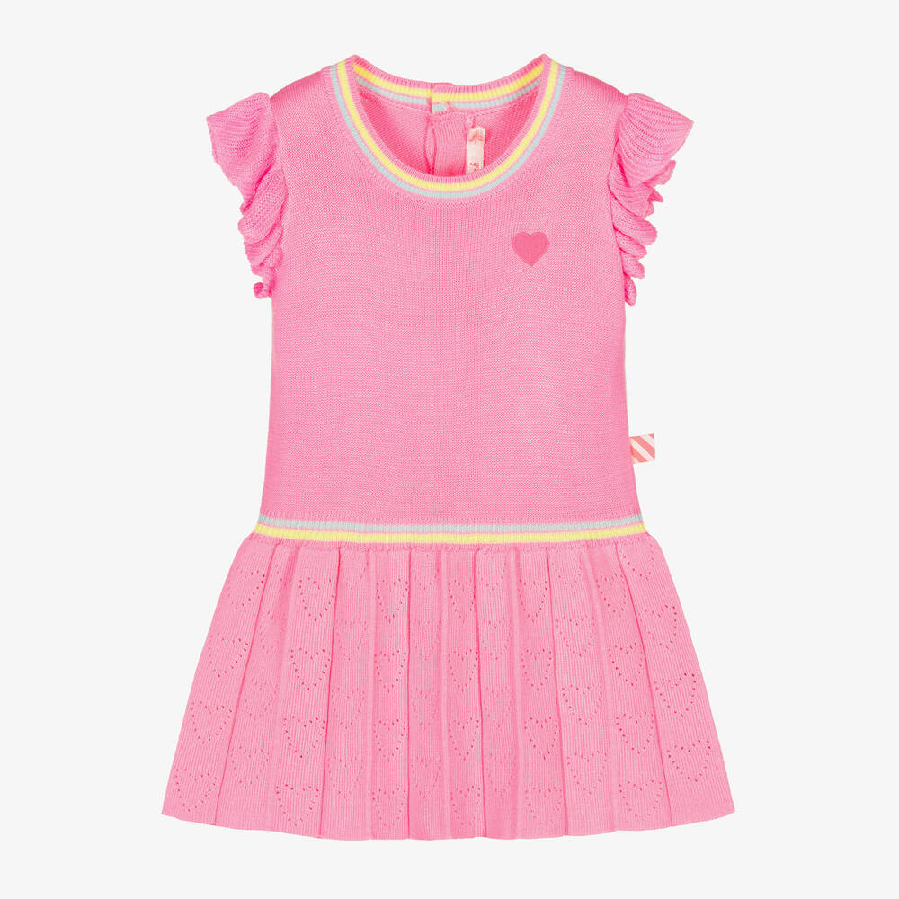 Neon pink dress for little girls by Billieblush, made in a lightweight knit. With frills over the shoulders and pointelle hearts on the pleated skirt, it has an embroidered heart on the chest, and blue and yellow striped trims. It fastens with glittery pink buttons on the back.