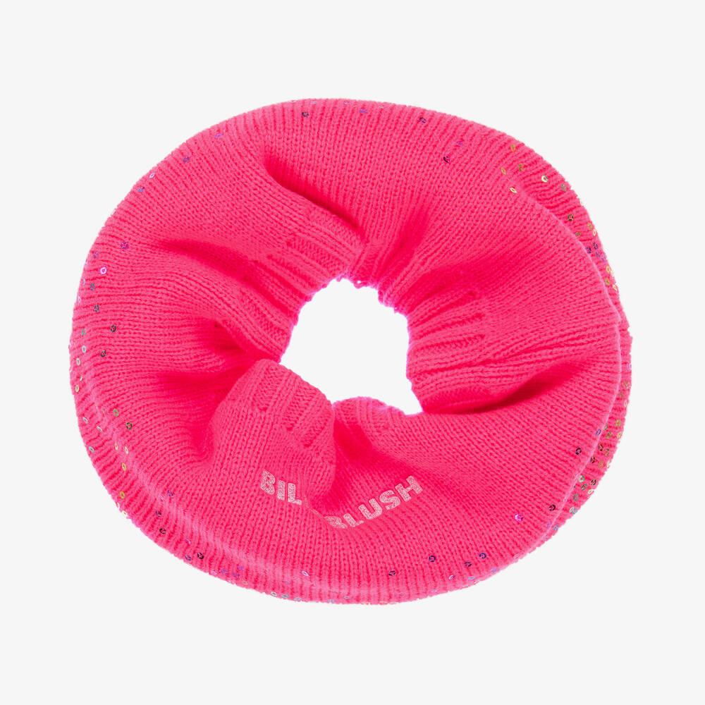 Bright neon pink snood for girls by Billieblush, made in a soft, double layer knit. Cosy and warm with ribbed trims, it is decorated with colourful sequins for a sparkly finish and it has a glittery pink rubberised logo on the front.