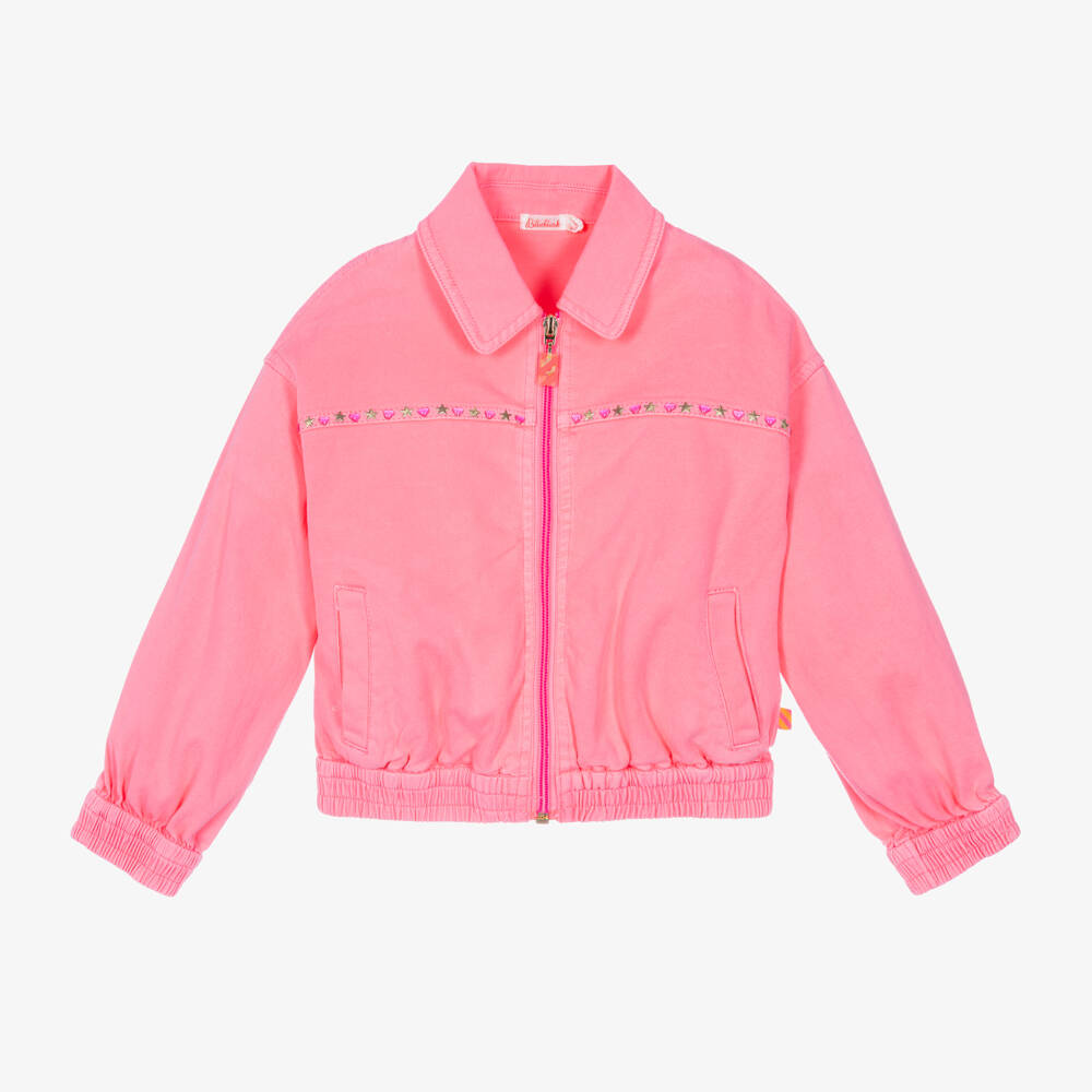 Stylish bomber jacket for girls by Billieblush, in the brand's signature shade of neon pink. Woven in soft cotton twill, this fabulous outerwear piece is adorned with playful heart and star studs across the chest. The designer's striped logo can be seen on the zip pull, securing the style simply.