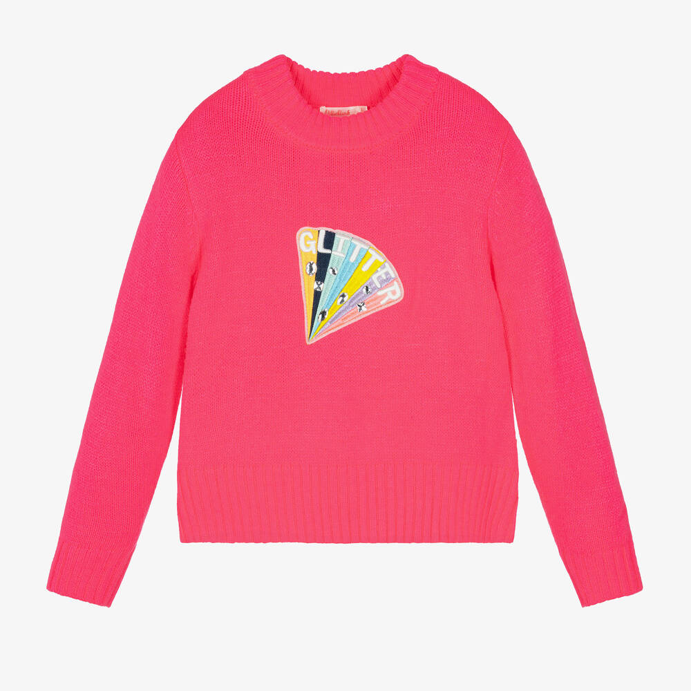 Bright neon pink sweater for girls by Billieblush, made in a soft, mid-weight knit. It has cosy ribbed trims and a diamond-shaped, rainbow-coloured embroidered appliqué on the front decorated with sparkling gemstones and the word 'Glitter' across the top.