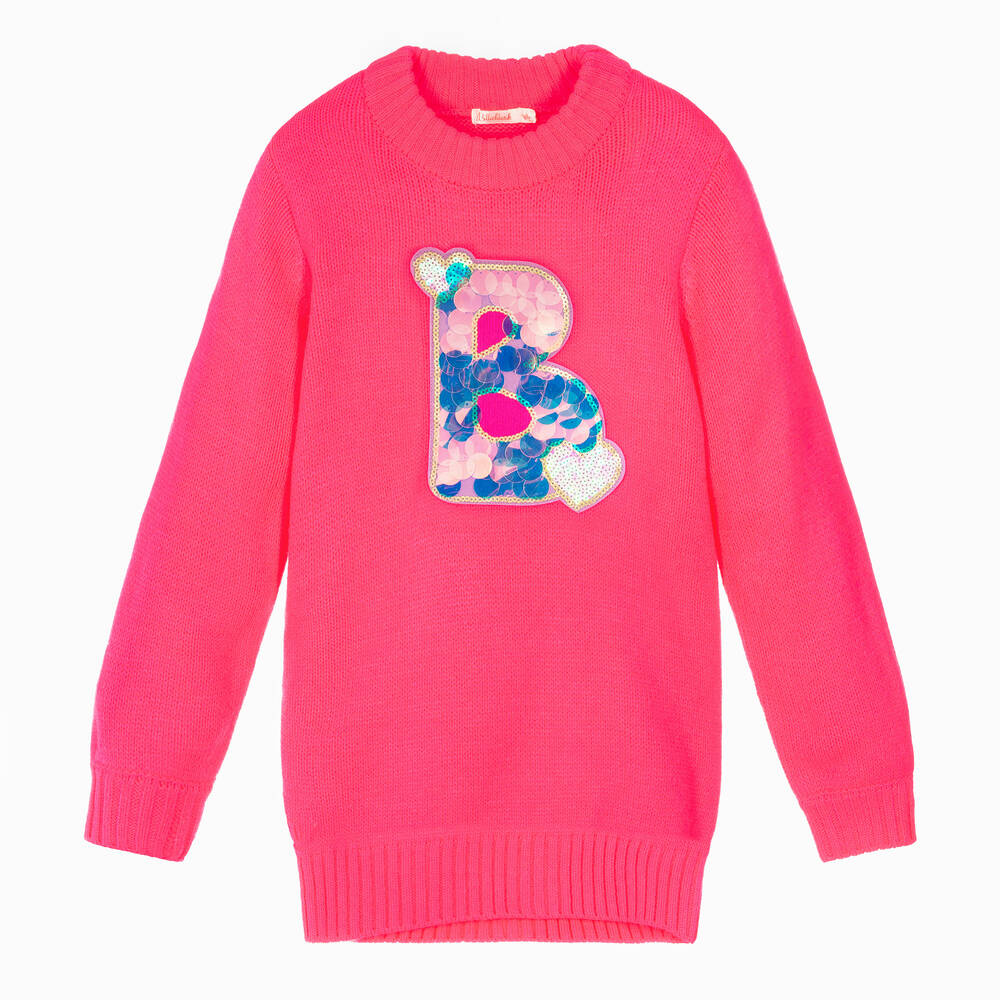 Bright neon pink dress for girls by Billieblush, made in a soft, mid-weight knit. Warm and cosy, it has ribbed trims and features a large felt 'B' appliqué on the front decorated with large pearlescent sequin discs and pink and gold sequins.