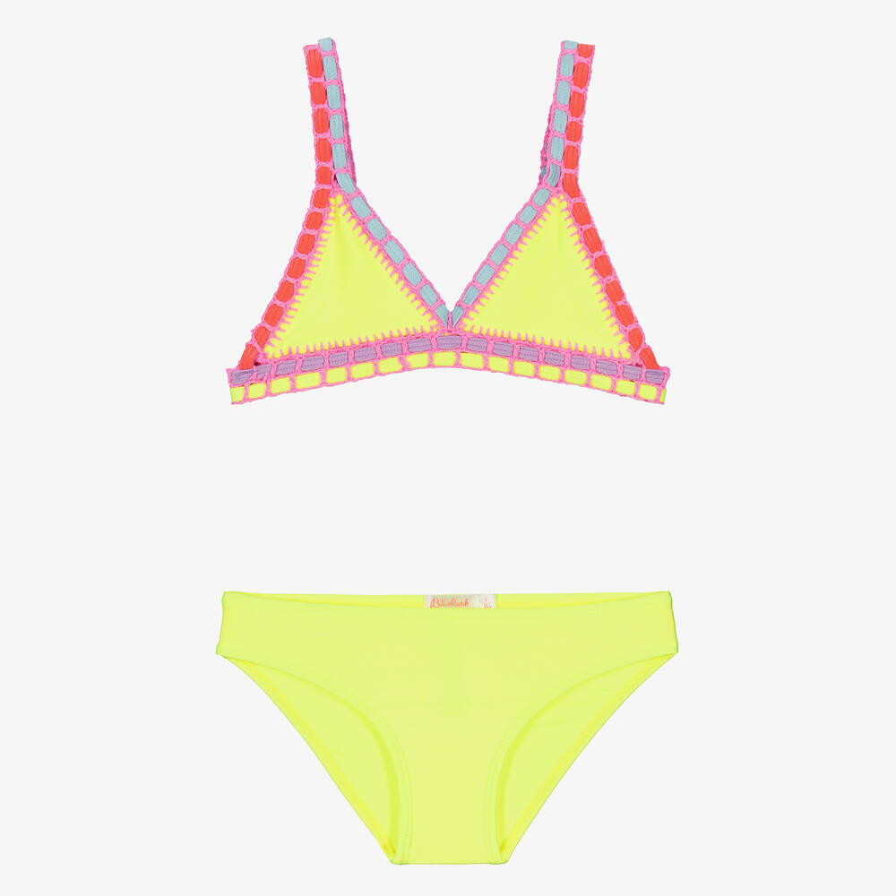 Fun neon yellow bikini for girls from Billieblush. The top has pale blue, orange and lilac purple trims encased in lovely pink crochet edges for a super stylish look. The front is lined for comfort and it fastens with a clasp on the back. Silky smooth and stretchy, the coordinating bottoms are in plain neon yellow.