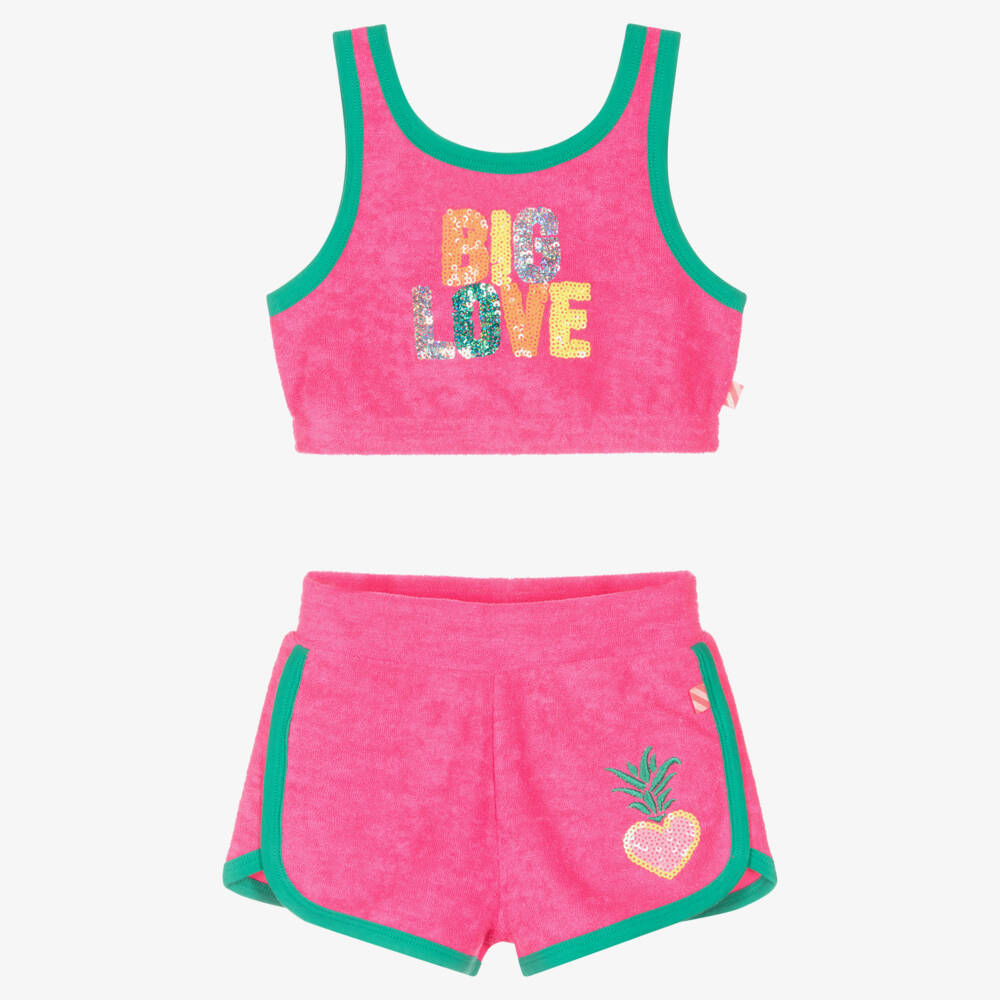 Sporty and fun, a bright pink towelling shorts set for girls by Billieblush. The cropped top shimmers with the words 'Big Love', whilst the shorts have a coordinating sequinned and embroidered pineapple on one side. The set is trimmed in contrasting green jersey and has the brand's striped pink logo tabs on the side seams. Easy to wear, both pieces simply pull on.