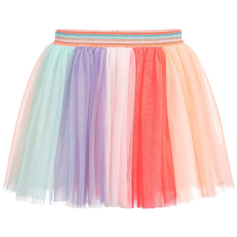 Pretty pink, orange, turquoise blue and purple skirt by Billieblush. The striped tulle is full and gathered, there is a lightweight cotton lining and a comfortable, glittery elasticated waistband.
