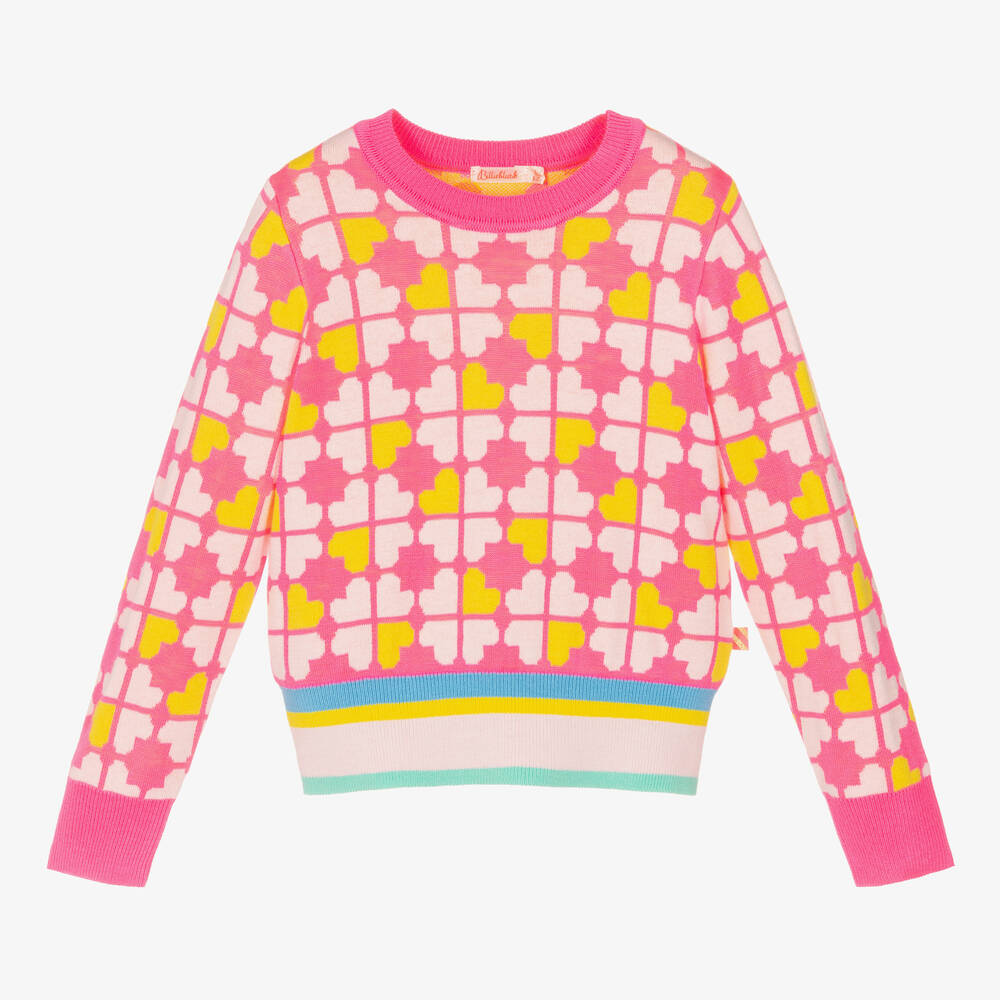Beautifully soft cotton and viscose blend sweater for girls by Billieblush, in the brand's signature neon pink. Eye-catching, it has a yellow and white four leaf clover pattern, incorporating little hearts in the design. The cosy, ribbed trims are in neon pink, and striped in blue, yellow, pink and green on the hem.