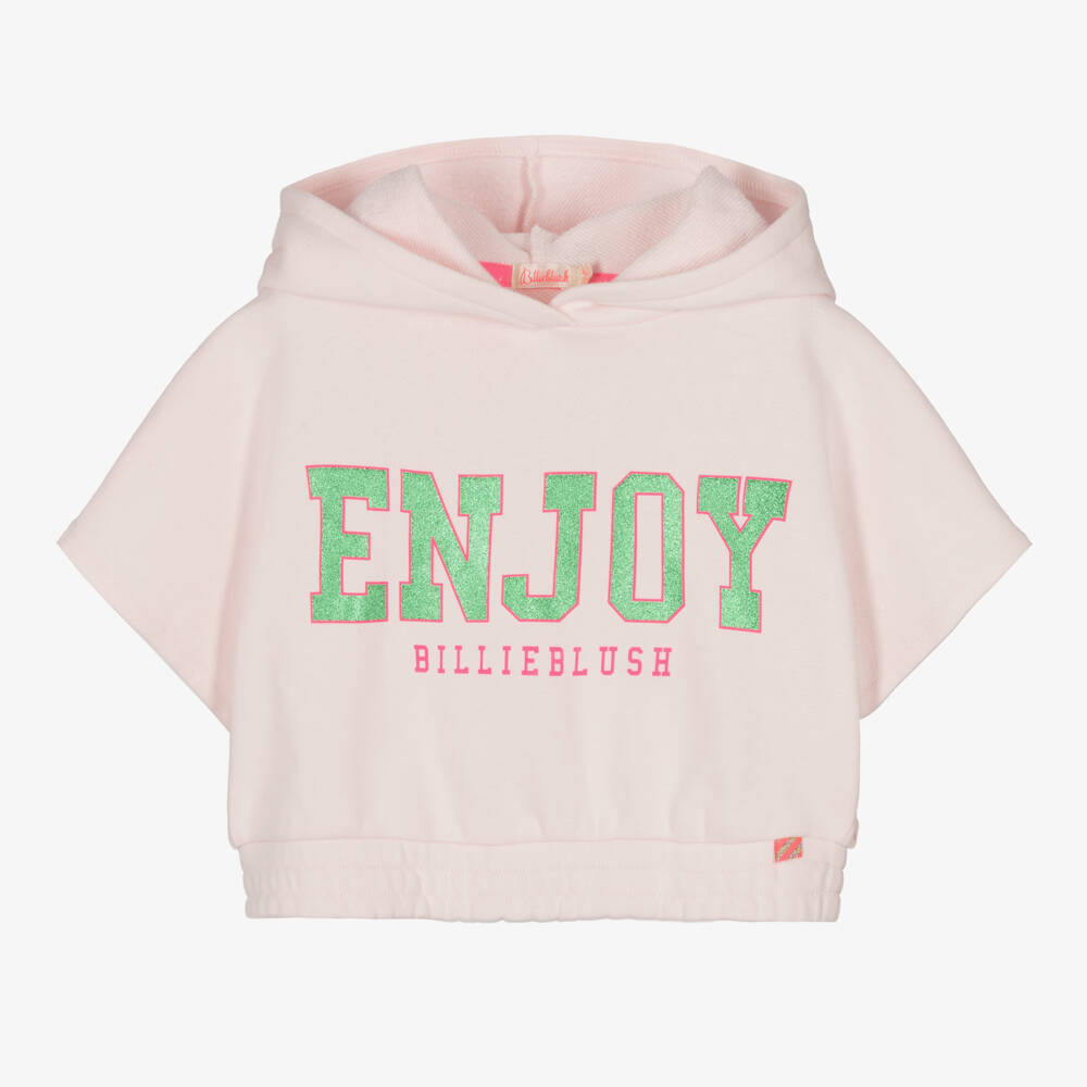 Pale pink sweatshirt for girls by Billieblush, made in comfortable cotton jersey. It has an eye-catching, varsity look with a glittery green and neon pink 'ENJOY' slogan printed on the front, and the brand's pink logo below. The short, seamless sleeves that are open to the waist, the large cosy hood and an elasticated waistband create a cool, slouchy fit.