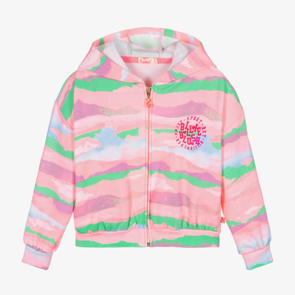 Relaxed pink zip-up hoodie for girls by Billieblush, made in beautifully soft jersey for a comfortable wear. Bold and spirited, it has a wonderful all-over landscape design with a sporty brand logo on the chest. It has a zip fastening and cosy pockets on the front.
