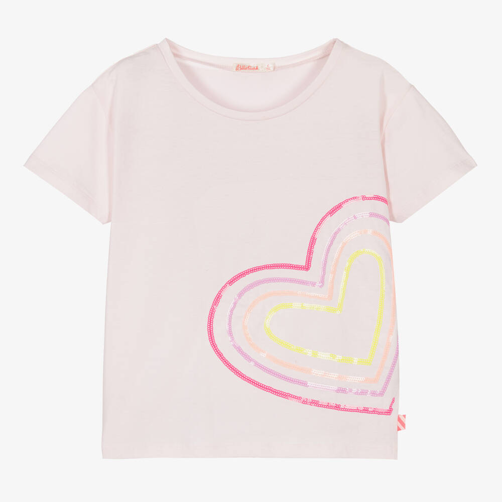 Casual light pink T-shirt for girls by designer Billieblush, made in soft and comfortable cotton jersey. Fun and striking, it has a colourful sequined heart motif on the front, with the brand's signature logo tab on the side.