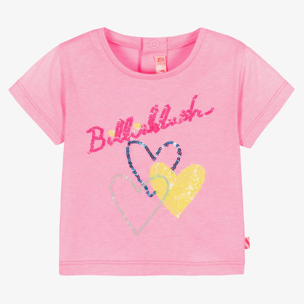 Pink T-shirt for little girls by Billieblush, made in a soft and breathable cotton jersey blend. For a dazzling girly style, this top has a colourful sequined heart and logo design with the brand's signature sparkly logo tab on the side. There are useful popper fastenings on the back to ensure that dressing is simple.