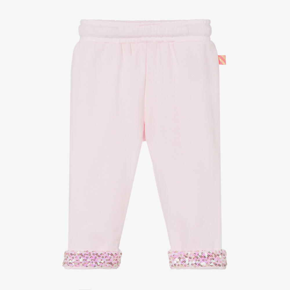 Pale pink joggers for younger girls by Billieblush, with gold, iridescent and pink sequins on the turn-up cuffs. They are made in soft and stretchy, mid-weight jersey and designed with an elasticated waist for long-lasting comfort. The brand's neon-coloured logo tab completes the look.