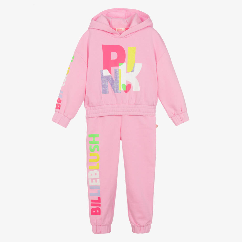 A fun and playful pink hooded tracksuit for girls by Billieblush. The top has a bold, colourful and glittery slogan print on one sleeve and on the front, with a matching coloured logo print down the side of the joggers. Cosy and comfy, the tracksuit is made in soft cotton jersey with a warm fleecy inside. The joggers have useful side pockets and both pieces have gently elasticated trims for a snug fit.