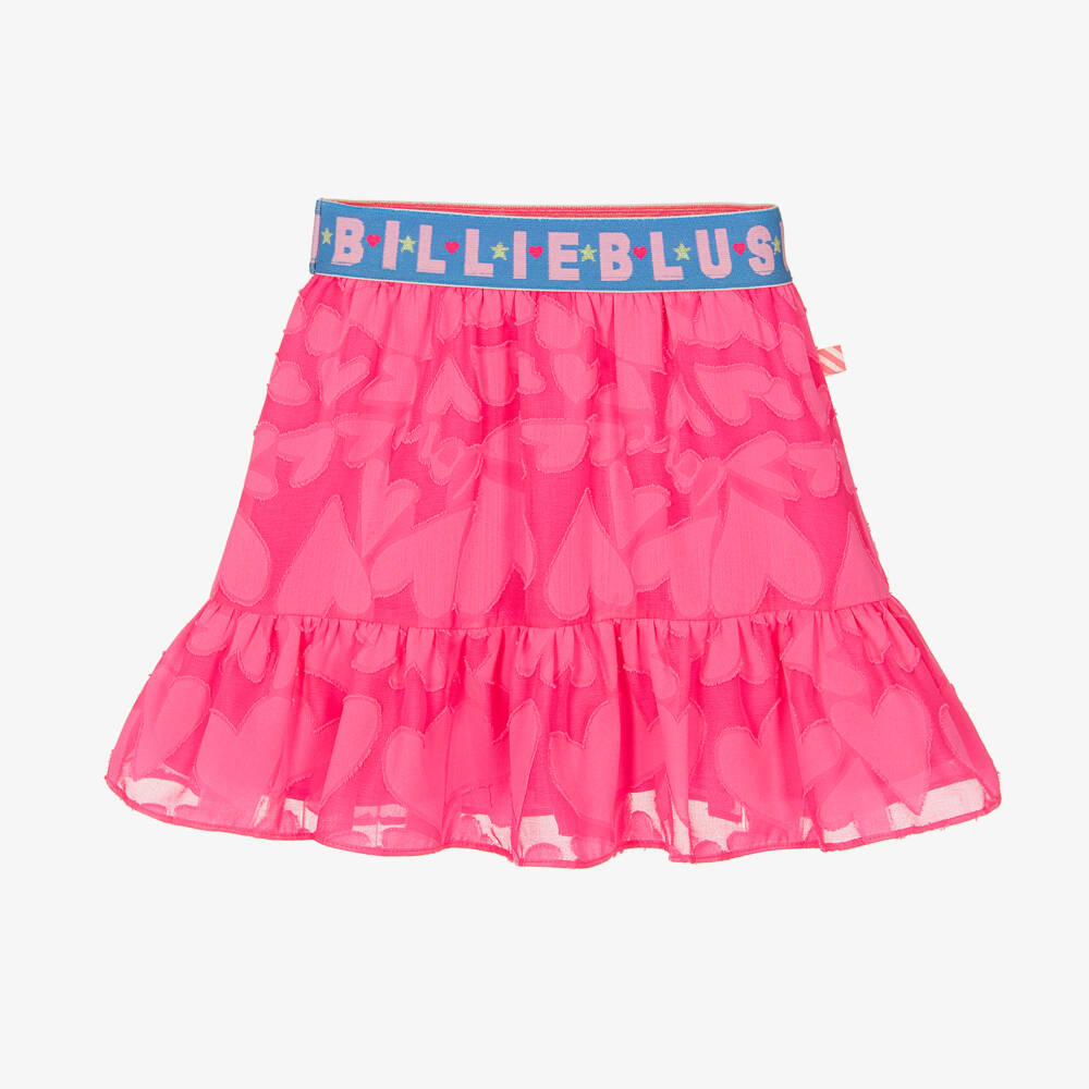 A fun and vibrant neon pink skirt for girls, by designer Billieblush. This soft, flowy tiered skirt has an embossed heart all-over design, with a blue elasticated logo waistband, and a branded tag logo on the side.