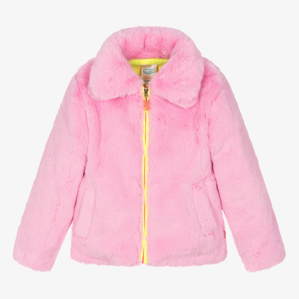 Pink jacket for girls by Billieblush, made in super soft faux fur. It has a silky, neon yellow lining, neon yellow zip fastening and front pockets. Part of the DC Comics capsule, it has a fun superhero appliqué on the back, with Wonderwoman, Superman and Batman figures and 'Move Over Boys' written above. This fun design has glitter, sequin and embroidered details and a glittery blue logo.