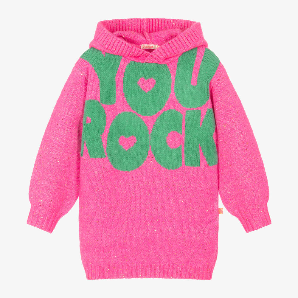 Bright neon pink hooded sweater dress for girls by Billieblush, knitted in a soft, mid-weight wool blend. For added sparkle, it is woven with metallic gold threads and decorated with tiny gold sequins. Cosy and warm, it has long sleeves, ribbed trims and a large green 'You Rock' slogan on the front.