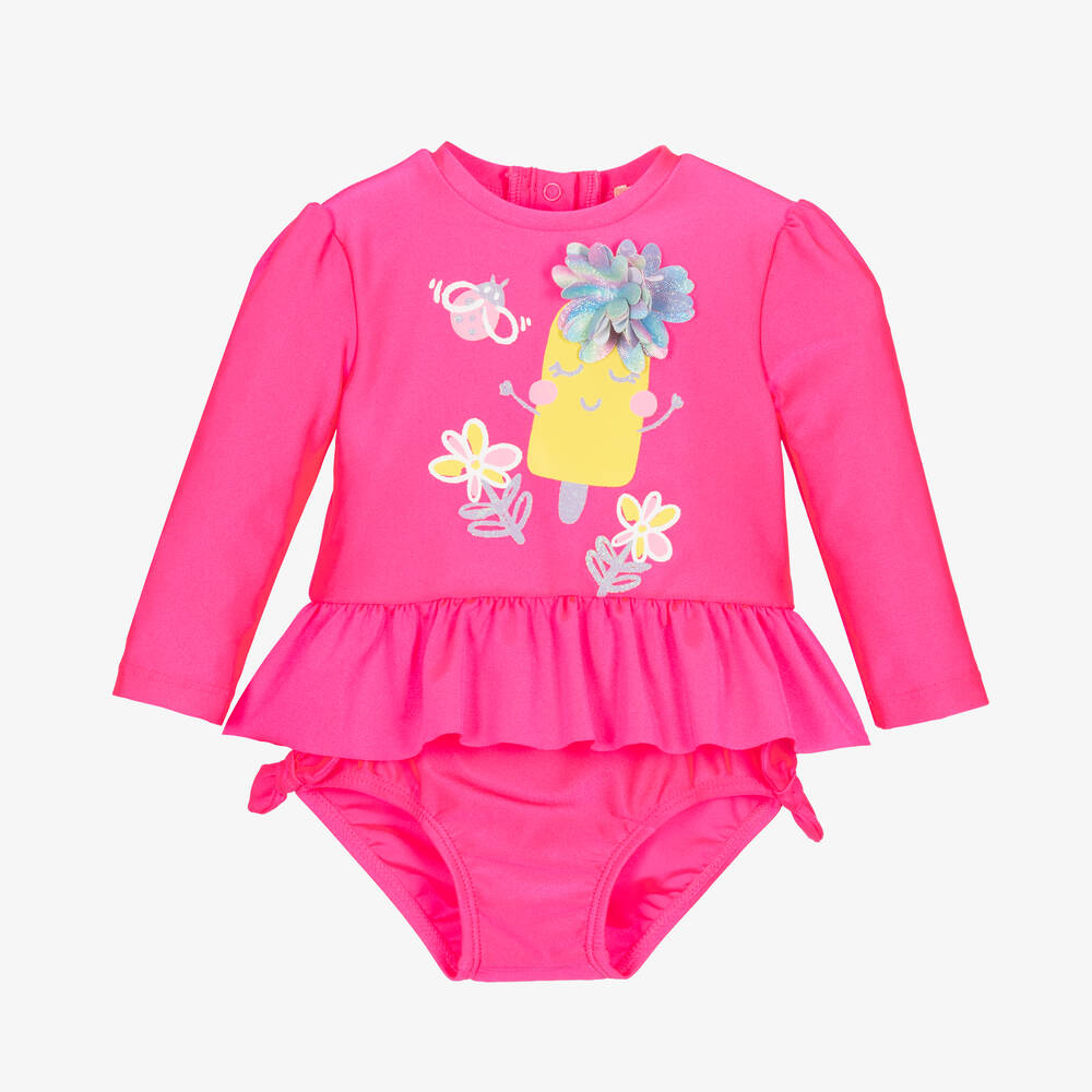Eye-catching tankini for little girls by Billieblush, in the brand's signature colour of neon pink. Soft and silky with UPF40+, the top has a yellow print of an ice cream, with an iridescent floral appliqué and long puffed sleeves. It is lined on the front for comfort and fastens with poppers on the back. The coordinating bottoms have cute, fixed bows on the sides.