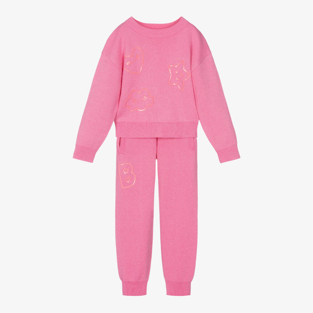A gorgeous pink tracksuit for girls by Billieblush, knitted in a soft cotton and viscose blend and woven with a glittery lurex thread. With comfortable ribbed trims, the sweatshirt has fun rubberised shapes on the front with different facial expressions. The matching bottoms have a rubberised 'B' on the leg and a glittery logo tab below the elasticated waist. Front pockets and gently ribbed cuffs add to the casual look.