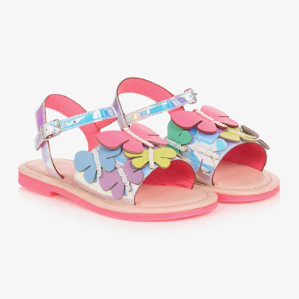 Lovely pink sandals for girls from Billieblush, with a silver side buckle fastening. Shimmering and iridescent, the foot strap is decorated with leather butterflies and sequins in a fun rainbow of hues. Detailed with the brand's signature neon pink colour, the insole and lining are made in wonderfully soft and comfortable leather. Gentle on little feet, the footbed is lightly padded and the soles are textured for improved grip.