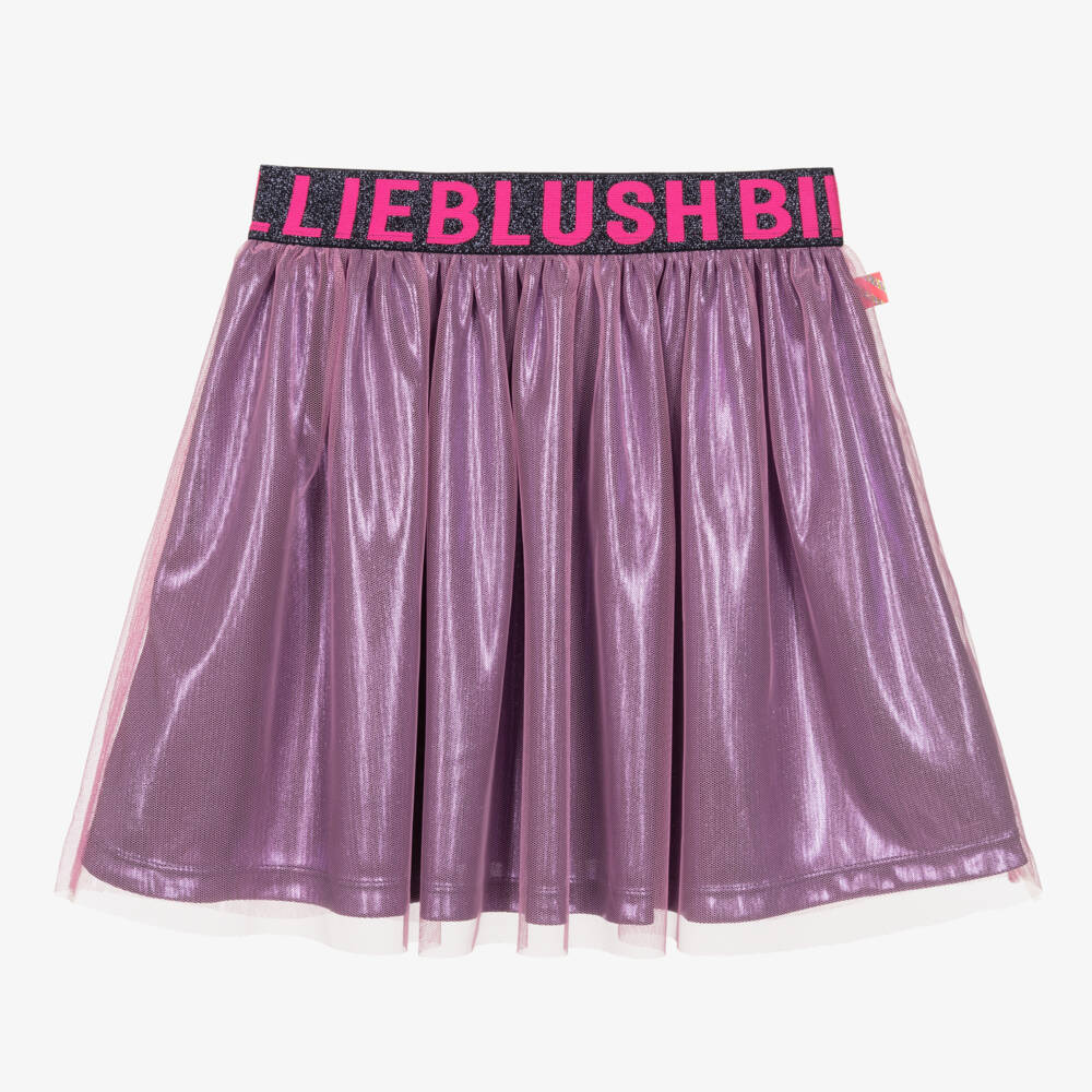 Stunning pink skirt for girls by Billieblush. The underskirt is silky, sparkly purple which complements the pink mesh top layer and creates lovely movement when worn. The navy blue elasticated waistband has a neon pink jacquard logo for brand recognition.