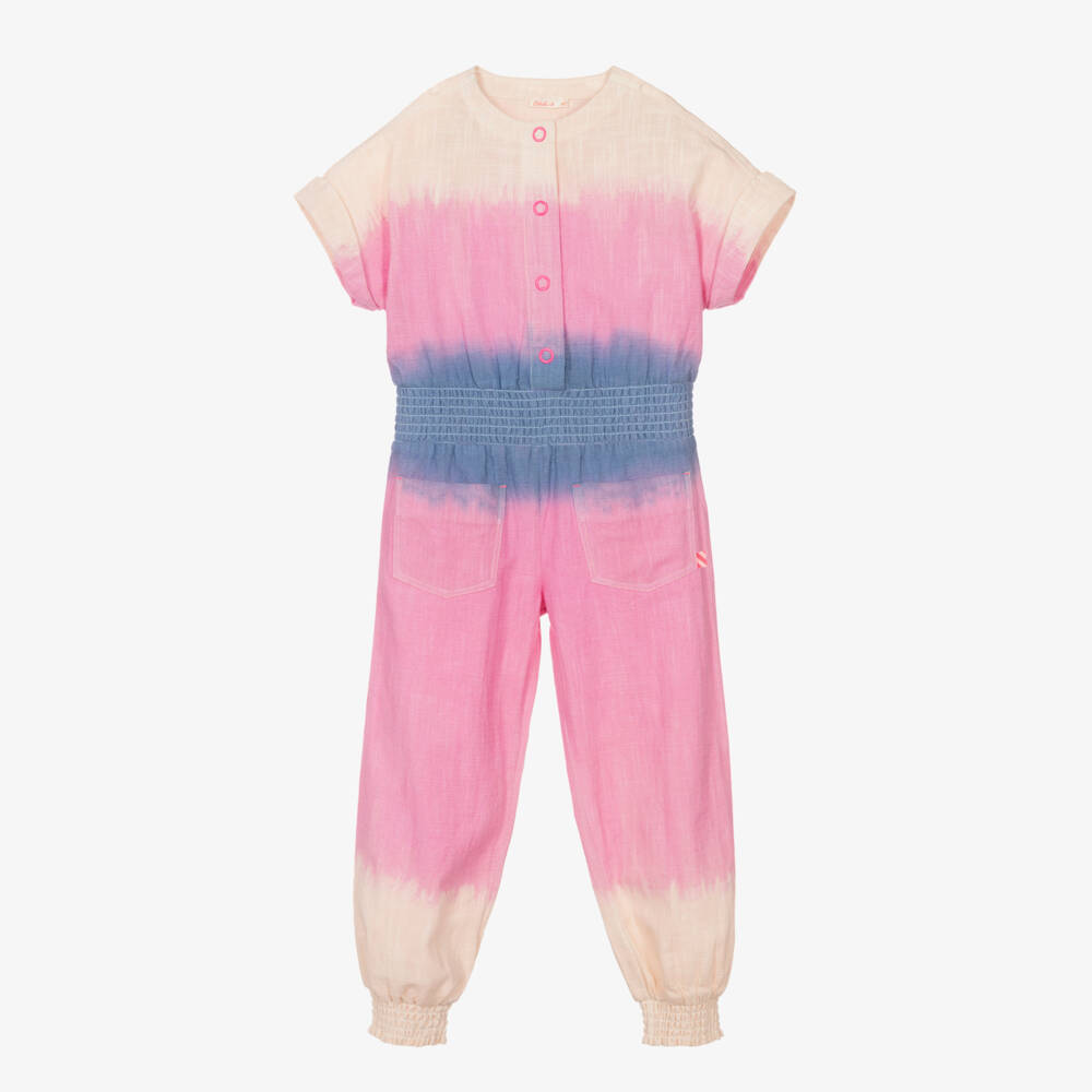 Dreamy pink and purple ombré jumpsuit for girls by designer Billieblush, made in soft, lightweight cotton. It has bright neon pink popper fastenings, cool turn-up sleeves and pockets on the front for a fun, bohemian style. It has an eye-catching rubberised glitter logo on the back, with a comfortable elasticated waistband and hems.