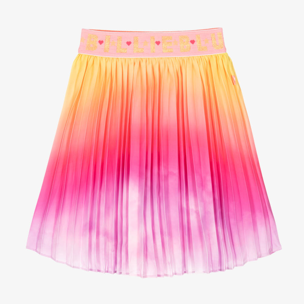 Lovely pleated pink ombré skirt for girls by Billieblush, with repeat glittery yellow logo and pink hearts all around the elasticated waist. Made in super soft satin, it fades from yellow, through to pink and purple. Easy to wear, it simply pulls on and has a lightweight, pink lining for comfort.