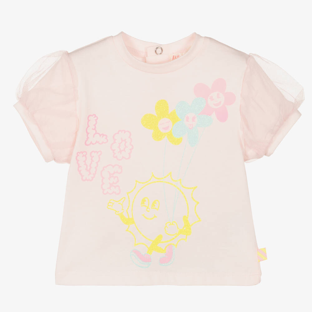Pretty pale pink T-shirt for little girls by Billieblush, made in soft cotton jersey. The short sleeves have a cute, puffed style and are finished with fine tulle. On the front, there is a glittery pink and yellow sunshine floral motif. It fastens with poppers on the back for easy dressing.