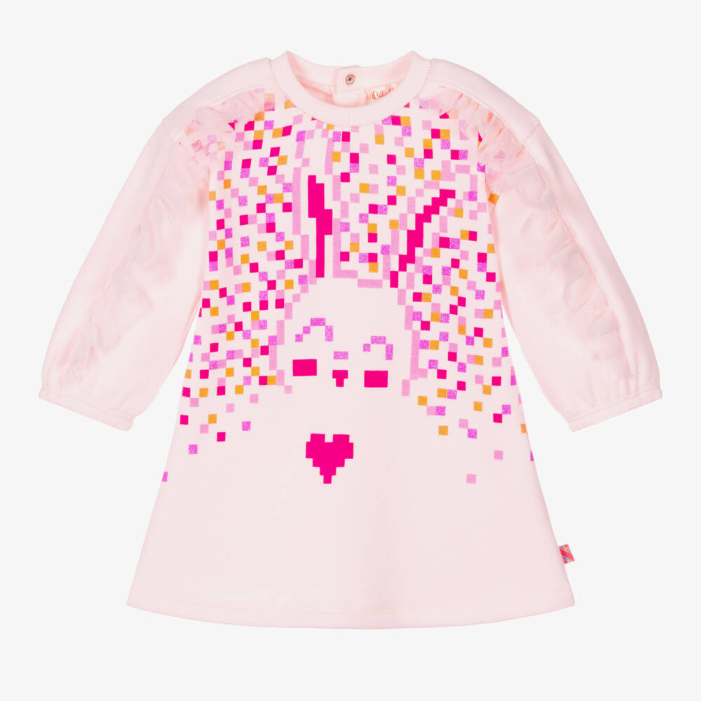 Pink cotton blend sweatshirt dress for little girls by Billieblush. Made in soft and comfortable jersey, it has a sparkling pixelated rabbit motif on the front in shades of pink and purple. This cosy dress has a super soft fleecy inside and stretchy ribbed trims. For a fun girly touch, there are pretty tulle trims down each sleeve and it has useful popper fastenings on the back for quick and easy dressing.