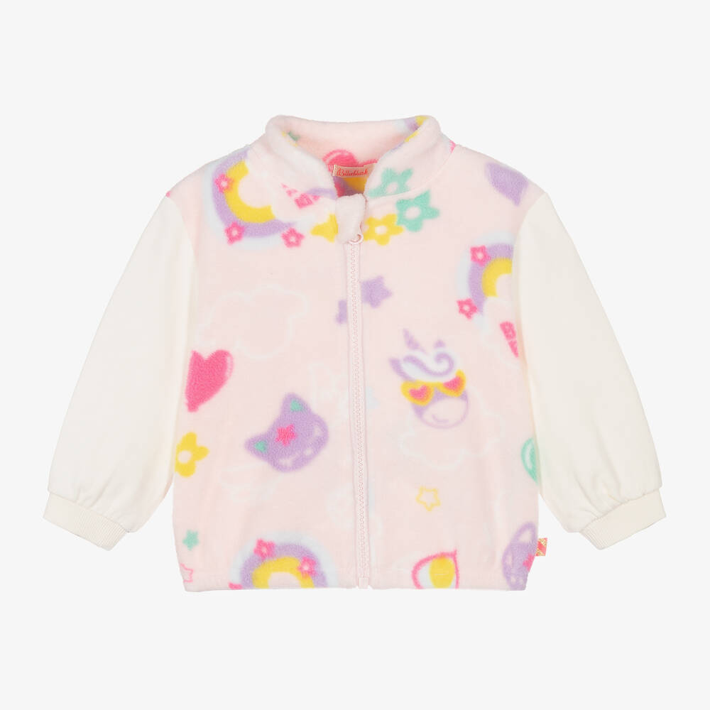 A pale pink zip-up top for little girls from Billieblush, made in super-cosy fleece. This sweet design is decorated with little rainbows, stars and the label's branding in their signature neon pink colour. It has a stand-up collar, ivory cotton sleeves for comfort, and a logo tab on the side seam.