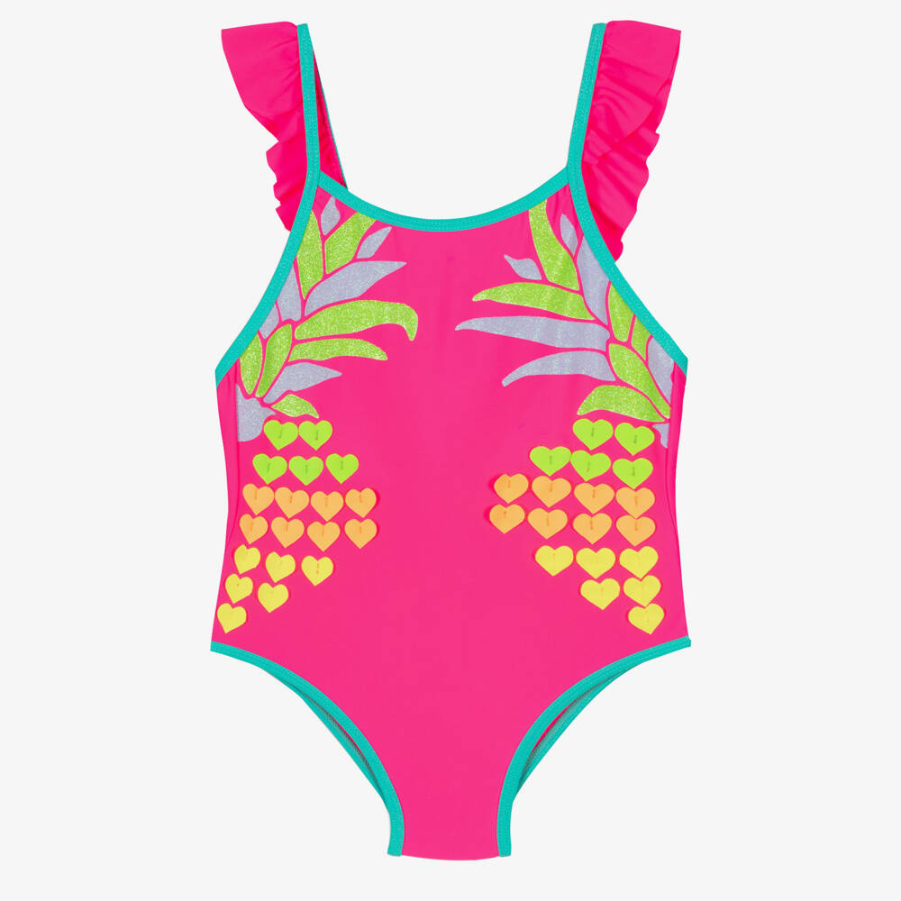 Vibrant neon pink swimsuit for girls by Billieblush, with a silky soft and smooth exterior. Tropical and summery, it has a colourful pineapple on the front, made with appliquéd hearts and glittery leaves. Ruffled shoulder straps and glittery aqua-green trims create a stand-out beach style.