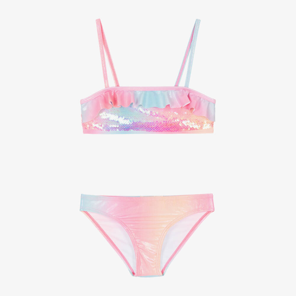 Fun bikini for girls from Billieblush, in neon pink, orange and blue shades with a cool iridescent metallic sheen. The bandeau style top has a cute frill trim and sparkly sequin detailing on the front. The back is shirred for a comfortable fit.