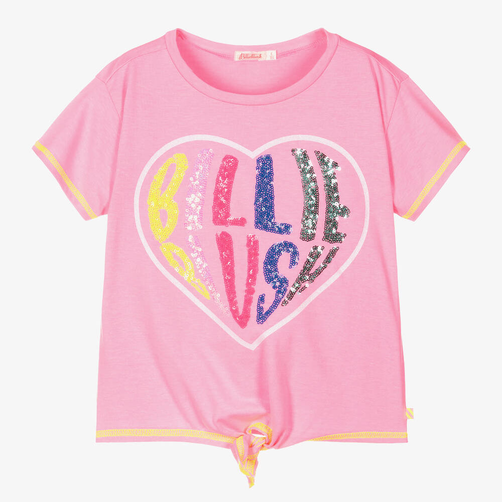 A bright pink short-sleeved T-shirt for girls by Billieblush, made in super soft cotton jersey. This vibrant top has a glittery love heart print with a colourful sequined logo design for eye-catching styling. It is finished with yellow stitched hems and a cute tie front detail.