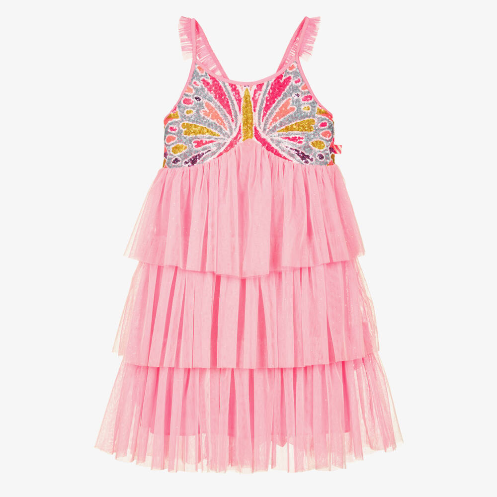 Eye-catching dress for girls by Billieblush, made in glittery pink tiers of bright pink tulle, with a shimmering sequinned butterfly bodice. Fully lined for comfort, it has frilled shoulder straps and a shirred back for a good fit. Easy to wear, it simply slips on over the head.