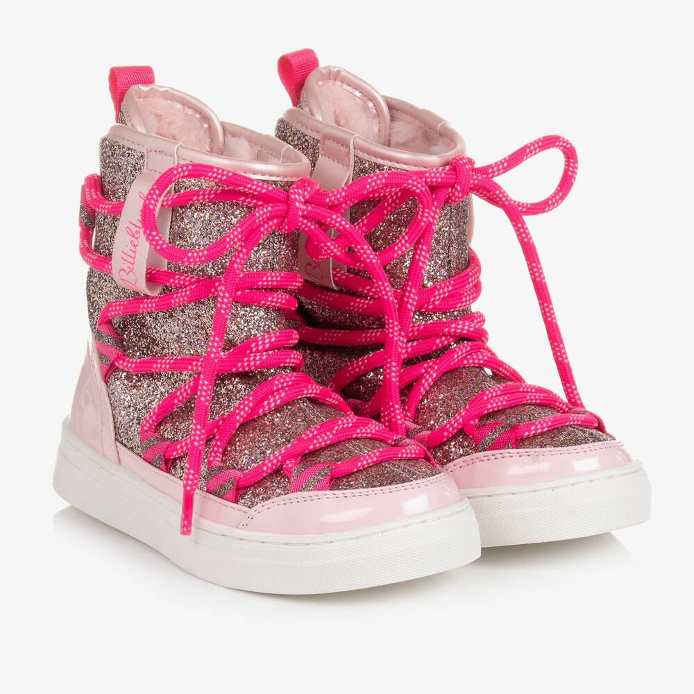 In eye-catching silver glitter with pale pink trims, these fun snow boots for girls are by Billieblush. They are made in smooth faux leather and lined in soft faux fur for cosy comfort. The insoles are made in smooth leather and the white soles are rubberised for good grip. They have split openings at the back to make them easy to slip on, with bright pink laces to adjust the fit. For a subtle designer touch, there are branded tabs at the sides.