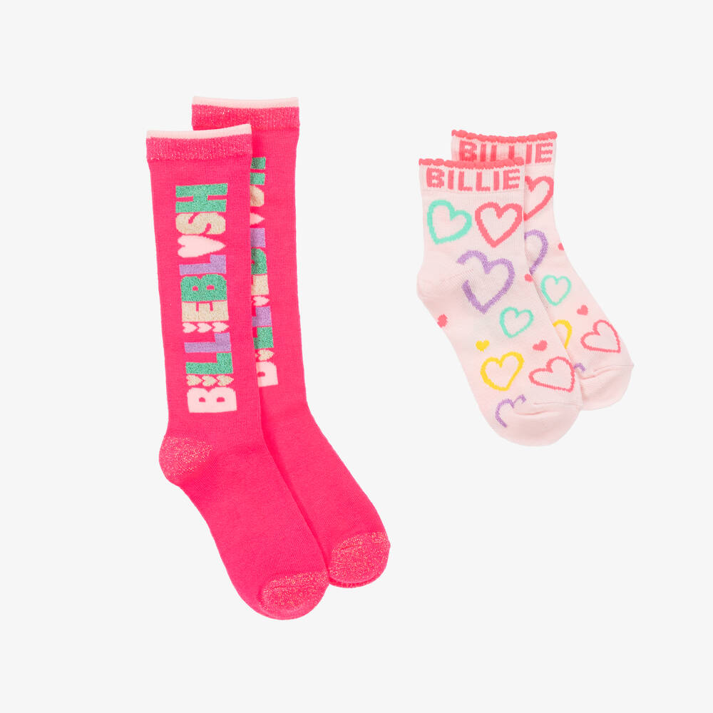 In a pack of two pairs, these fun and colourful socks for girls are by Billieblush. Knee length, the fuchsia pink pair has sparkly trim on the toes and cuffs, with the designer's logo in bright and glittery letters. The ankle length pale pink pair is patterned in multicolour hearts, with the designer's name around the scalloped cuffs.