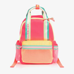 Pink backpack for girls by Billieblush, made in smooth twill with colourful sequin stripes on the front and sides. The spacious main compartment fastens with a zip and there are external mesh pockets on the sides ideal for bottles. There is a large zipped pocket on the front with an iridescent coating and fun ice cream appliqué. The back and adjustable shoulder straps are padded for comfort and there are useful logo branded carry handles with a popper fastening strap to keep them together.