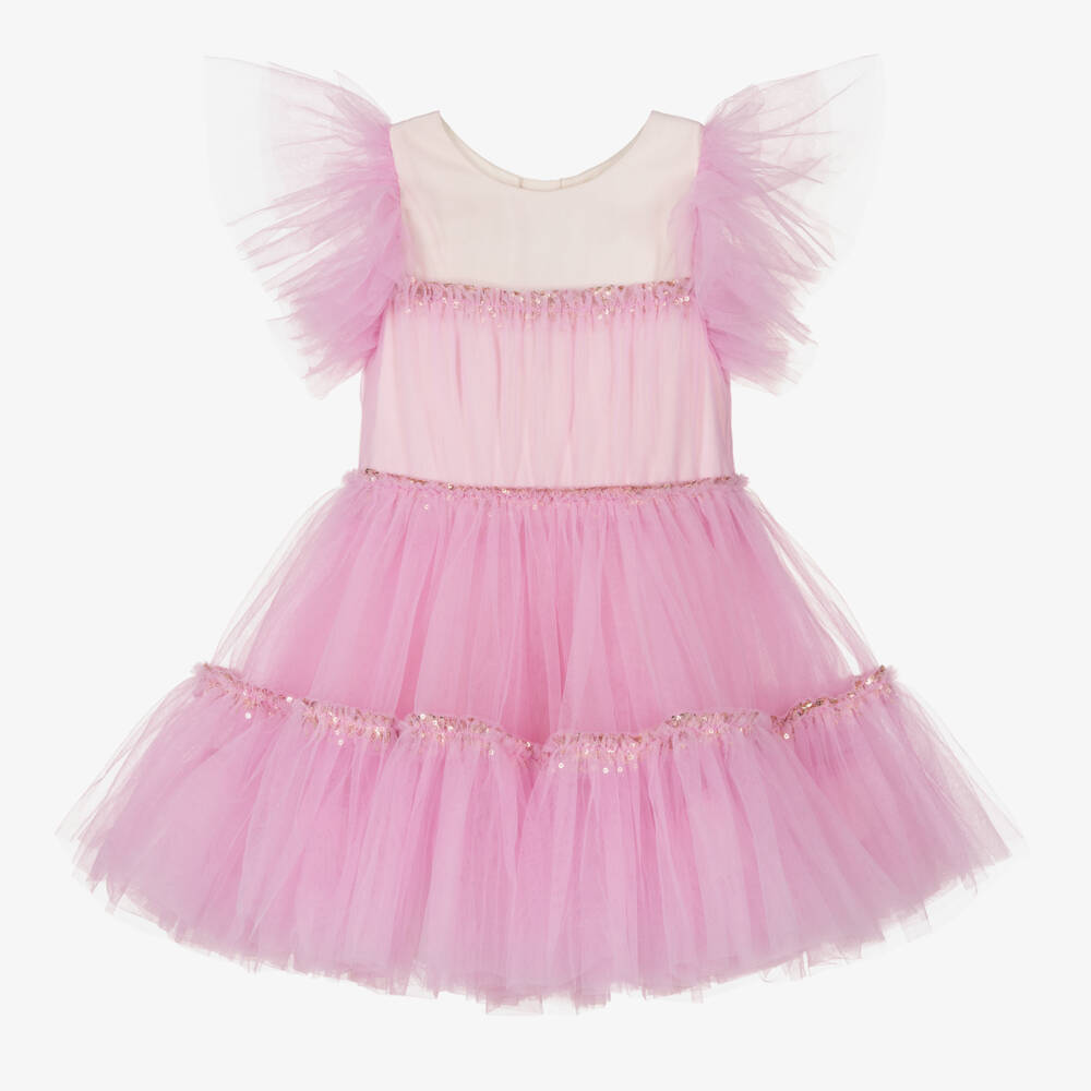 Stunning pastel pink tulle dress for girls by Billieblush. So pretty for special occasions, it has generous layers of tulle and ruffles for an exceptionally flared silhouette, with sparkly gold sequin trims. The ivory viscose lining adds comfort and contrast to this panelled dress. It fastens with a concealed zip on the back for a seamless finish.