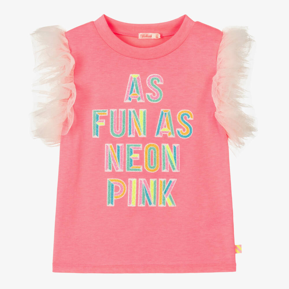 Fun neon pink T-shirt for girls by Billieblush, with short sleeves in pale pink tulle for a stand-out look. Made in soft cotton-blend jersey, it has a glittery slogan print on the front and a branded tab on the side seam.