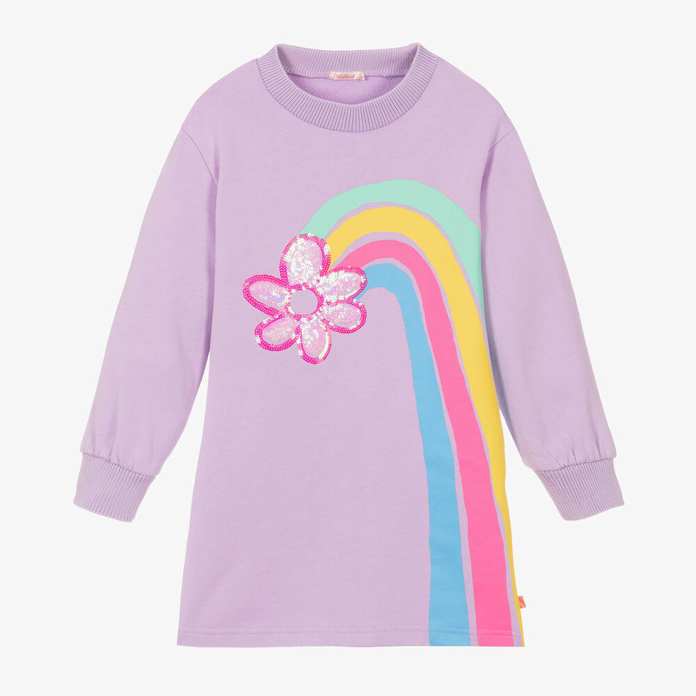 A lilac purple sweatshirt dress for girls by Billieblush, made in mid-weight cotton jersey for easy dressing. This bright and colourful design has a rainbow flower on the front with iridescent sequins on the petals. The ribbed neckline and stretchy cuffs are woven with lurex thread for a gentle shimmer with movement. On the back, the fabric gathers in the middle with a fixed knot detail.