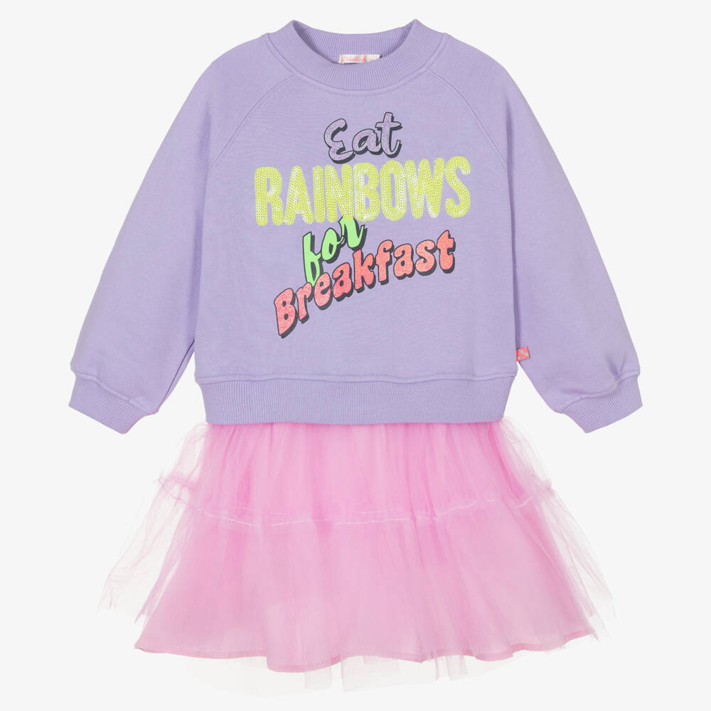 Fun and playful for girls, this purple and pink dress is by Billieblush. The cotton sweatshirt bodice has a colourful 'Eat Rainbows For Breakfast' slogan on the front, in printed and sequinned letters, with glittery detailing for a touch sparkle. The tiered tulle skirt has a stiffer tulle underskirt to add volume, with a lightweight viscose lining for comfort.