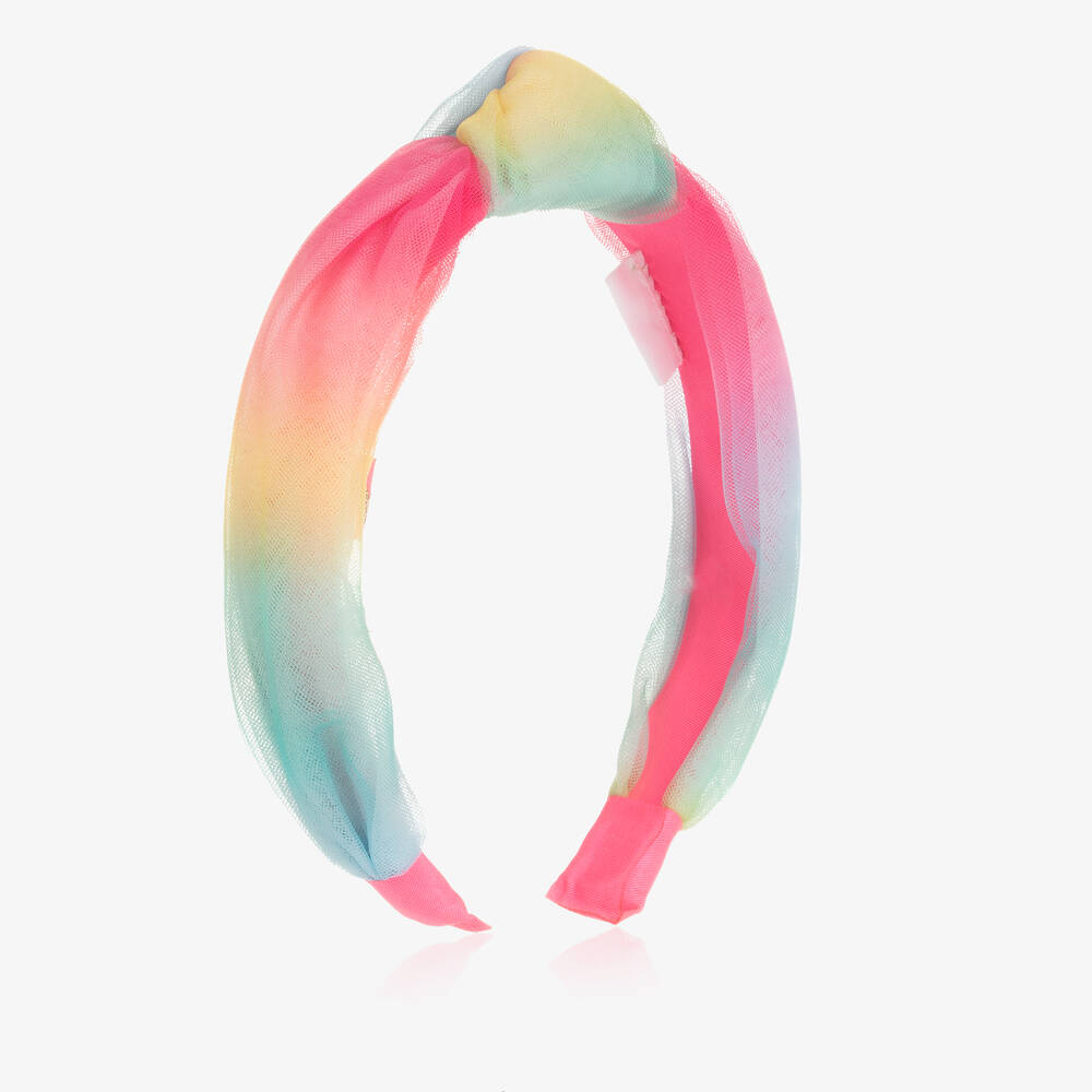 Fun and colourful hairband for girls from Billieblush, an exclusive to Childrensalon. Made from layers of fine tulle in rainbow ombré shades with a knot on the top, it is set on a neon pink satin-covered band.
