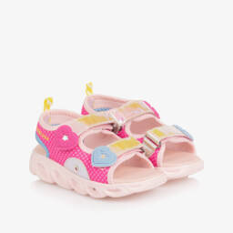 Silver sandals for girls by Billieblush with neon pink trims. The uppers are made from glittery silver mesh and fasten with a velcro strap across the front of the ankle. There is a signature neon pink logo on the strap and a matching logo on the rubber footbed. These cool sandals have ridged non-slip rubber outer soles.