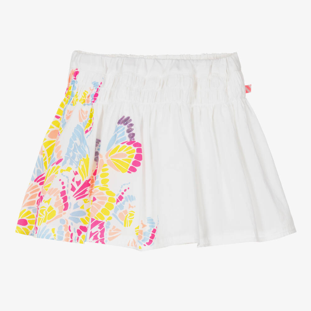 White cotton skirt for girls by Billieblush, with a colourful butterfly print shimmering in sequins. Lightweight and lined in voile, it is full and gathered, with a comfortable elasticated waist and ruched detailing below.