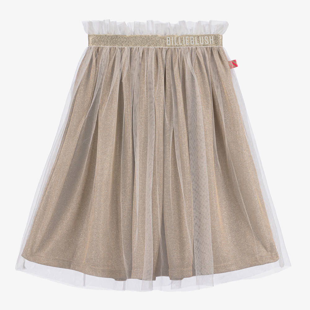 Girls white tulle skirt by Billieblush with a comfortable glittery gold lining. Ideal for parties, this pretty piece has a stretchy elasticated waistband for a great fit with rubberised logo branding on one side. The brand's signature tab can be seen on the side seam to complete the look.