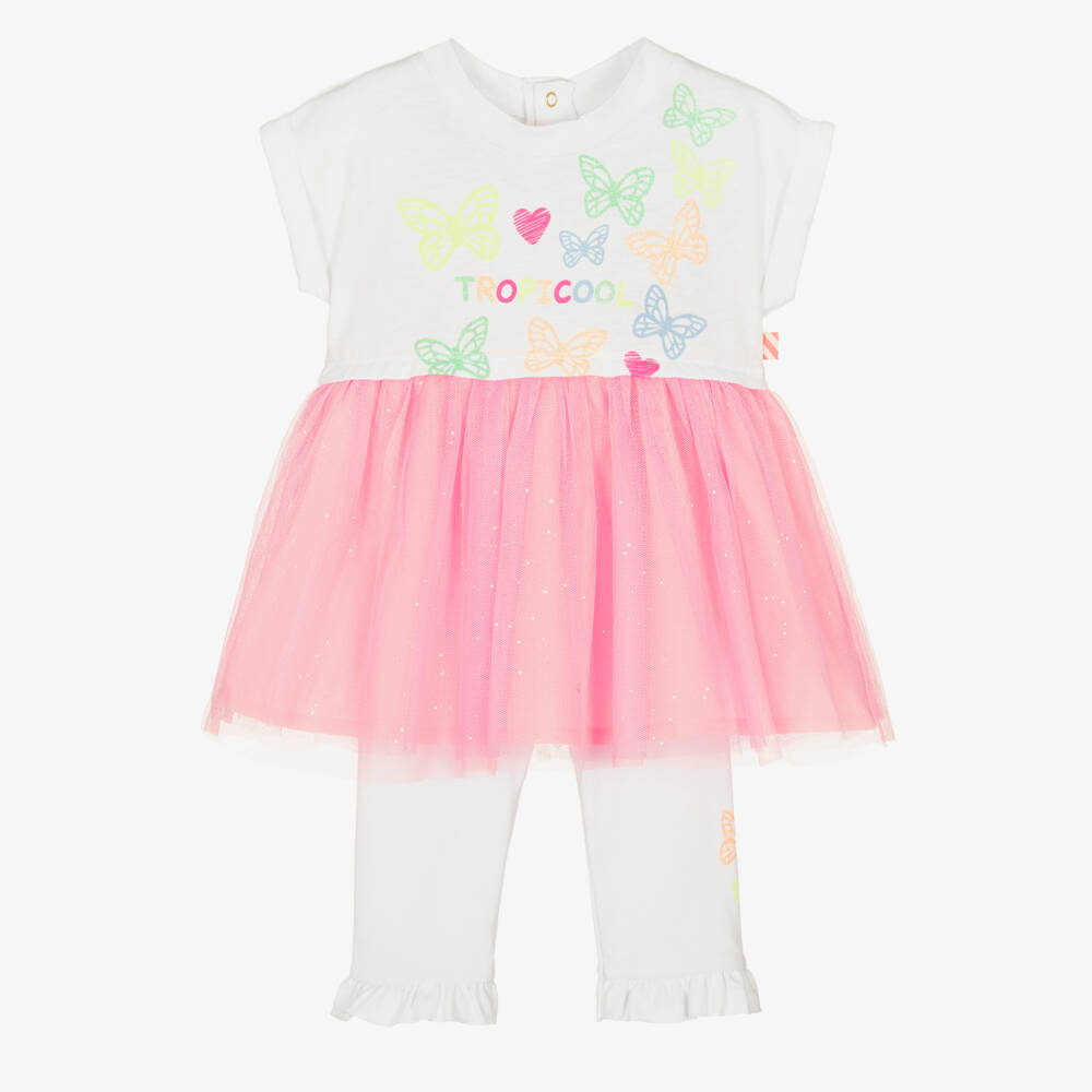 Stand-out white and pink dress set for little girls by designer Billieblush. The jersey dress has a colourful, glittery butterfly design, with 'tropicool' printed on the bodice and the brand's signature tag logo on the side. For added sparkle and style, the skirt is made in layers of shimmering tulle with a comfortable voile lining. It has turn-up sleeves and popper fastenings on the back. The soft cotton jersey leggings have coordinating butterflies on one leg, ruffled hems and an elasticated waistband.