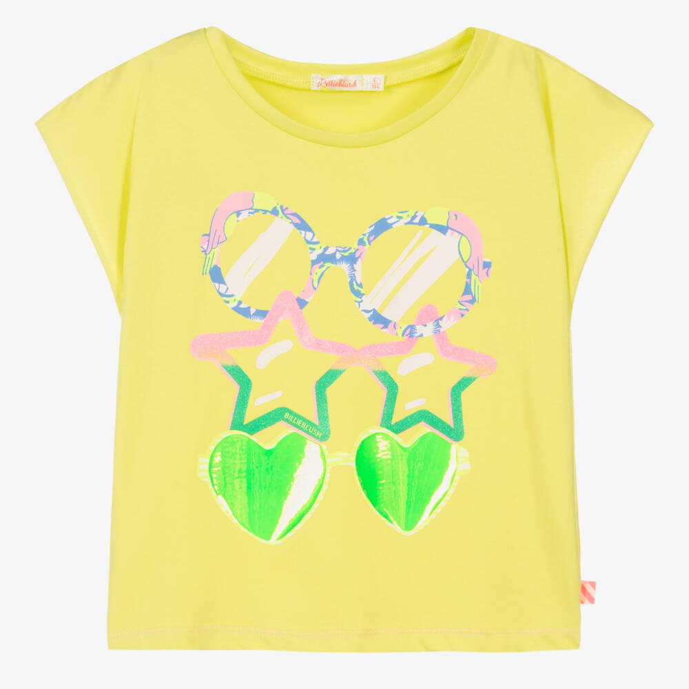 Neon yellow cotton T-shirt for girls by Billieblush, with an eye-catching print of pink, green and blue sunglasses glittering and shining on the front. Made in soft, comfortable jersey with raw-edged, capped sleeves, it is just right for casual days. The T-shirt has a boxy fit, pink overstitch detailing on the hemline and the brand's logo tab on one side seam.